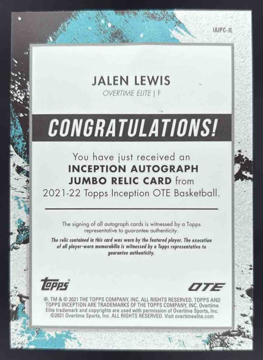 2021-22 Topps Inception Overtime Elite Jumbo Patches Jalen Lewis Auto 1/1