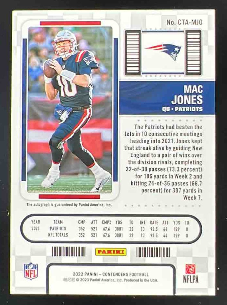 2022 Contenders Veteran Playoff Ticket Autograph #CTA-MJO Mac Jones Auto /25