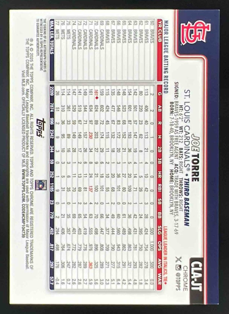 2025 Topps Chrome Chrome Legends Orange Refractor #CLA-JT Joe Torre Auto /25