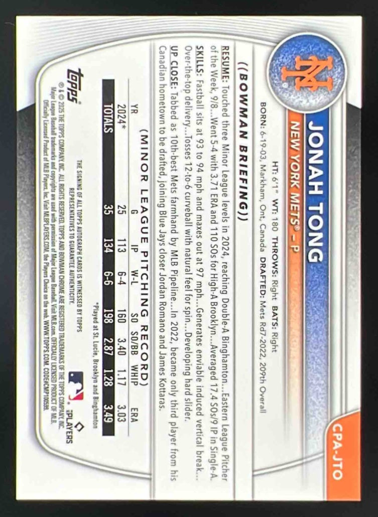 2025 Bowman Chrome Autographs #CPA-JTO Jonah Tong RC Auto
