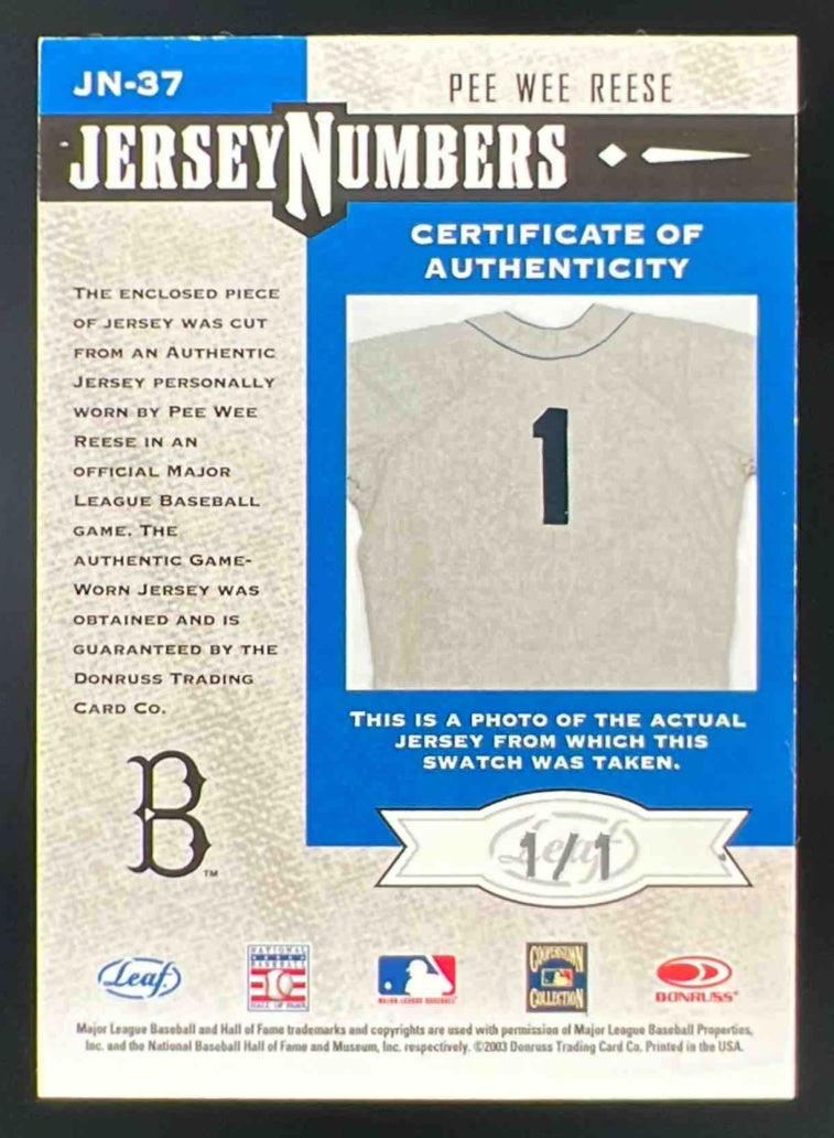 2003 Leaf Limited Jersey Numbers Retired #JN-37 Pee Wee Reese 1/1