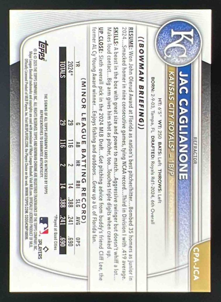 2025 Bowman Chrome Prospect Autographs Refractor Jac Caglianone Auto /499