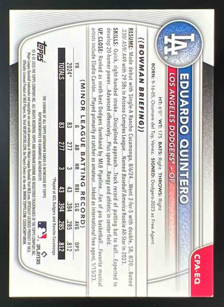 2025 Bowman Chrome Autographs Speckle #CPA-EQ Eduardo Quintero RC Auto /299