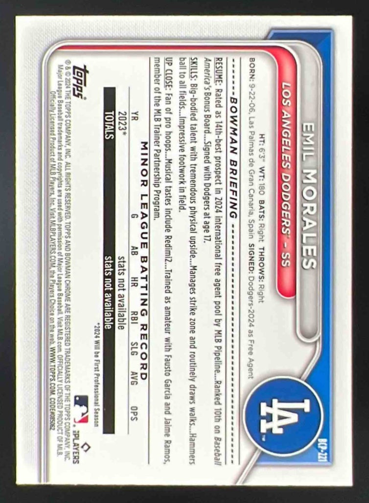 2024 Bowman Chrome Chrome Prospect Orange Refractor #BCP-221 Emil Morales RC /25
