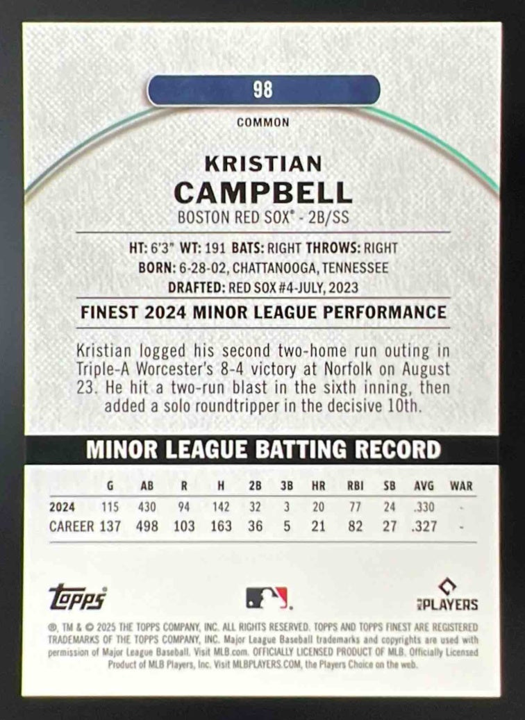 2025 Topps Finest Common Red #98 Kristian Campbell RC /10