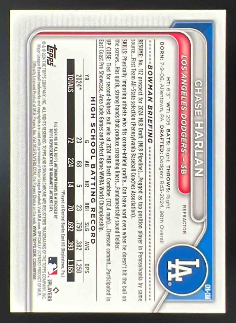 2024 Bowman Draft Chrome Autographs Refractor #CPA-CHA Chase Harlan RC Auto /499