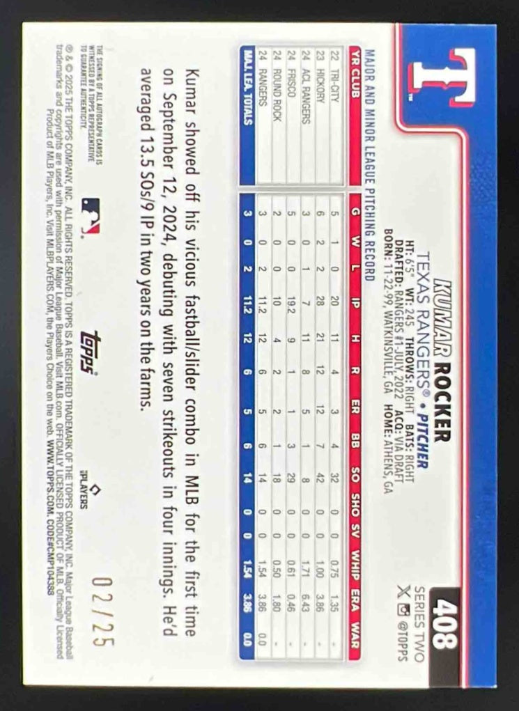 2025 Topps Real One Autographs Orange Foil #408 Kumar Rocker RC Auto /25