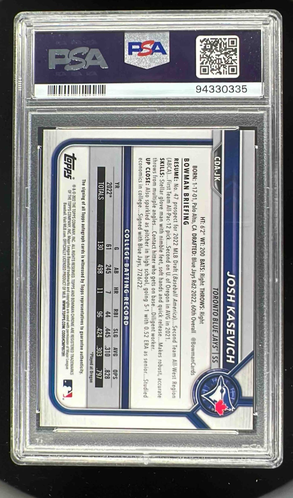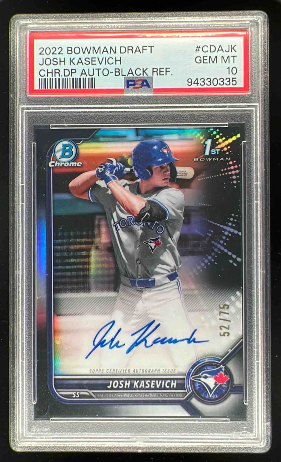 2022 Bowman Draft Chrome Black Refractor #CDAJK Josh Kasevich RC Auto /75 PSA 10