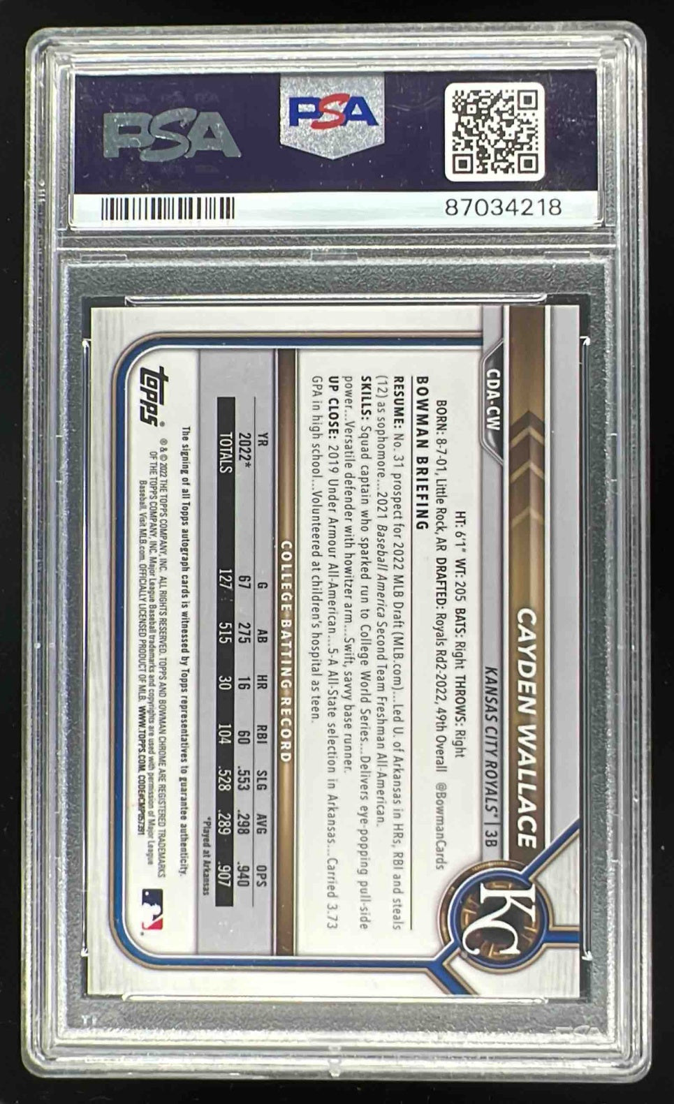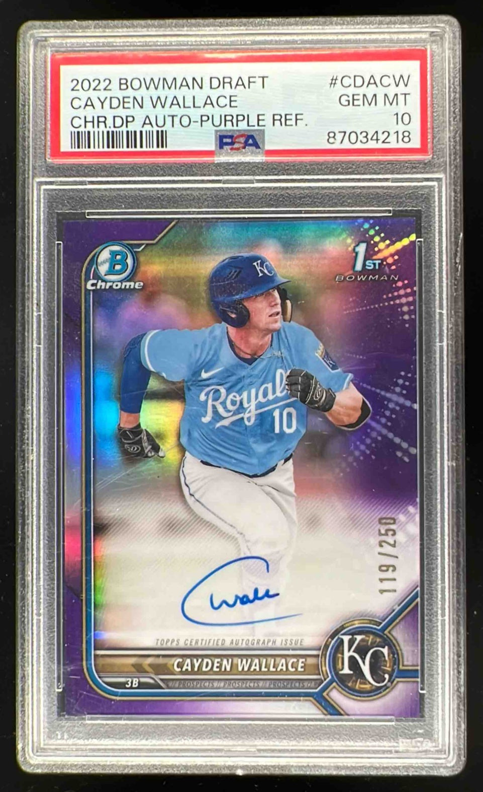 2022 Bowman Draft Chrome Pick Purple #CDA-CW Cayden Wallace RC Auto /250 PSA 10