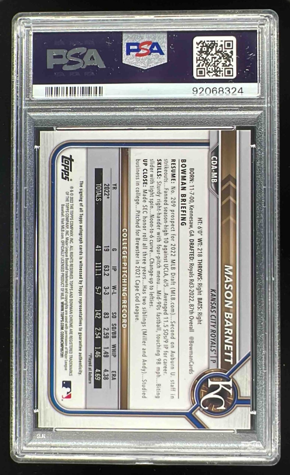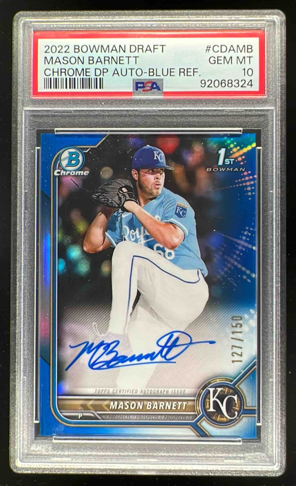 2022 Bowman Draft Chrome Pick Blue Refractor Mason Barnett RC Auto /150 PSA 10