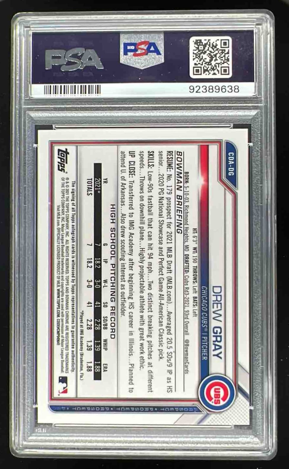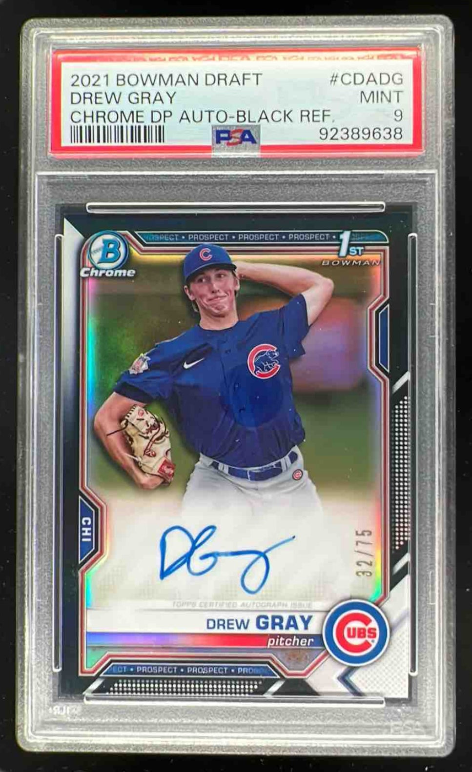 2021 Bowman Draft Chrome Pick Black Refractor #CDA-DG Drew Gray Auto /75 PSA 9