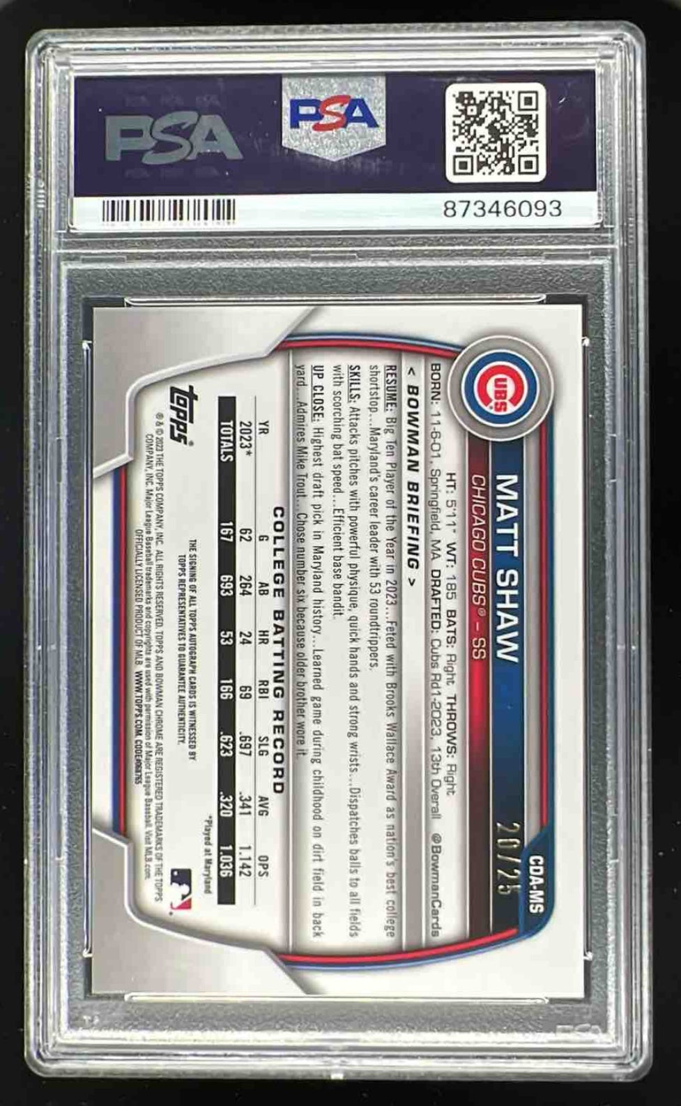 2023 Bowman Draft Sapphire Chrome Orange #CDA-MS Matt Shaw RC Auto /25 PSA 9