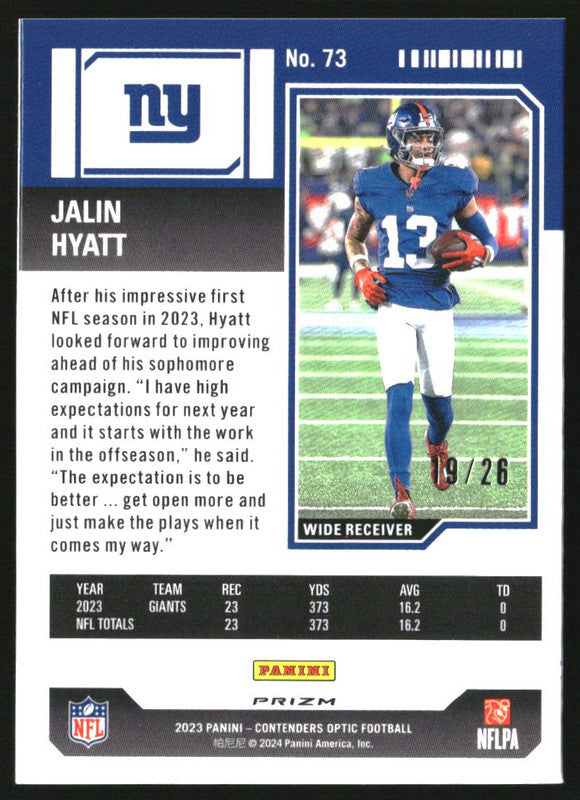 2023 Panini Contenders Optic Purple Pulsar #73 Jalin Hyatt RC /26