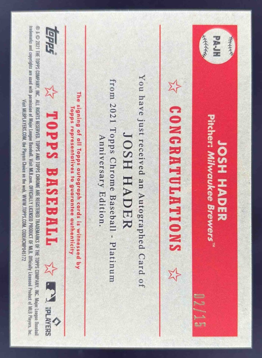 2021 Topps Chrome Platinum Anniversary Pink Refractor #PA-JH Josh Hader Auto /15
