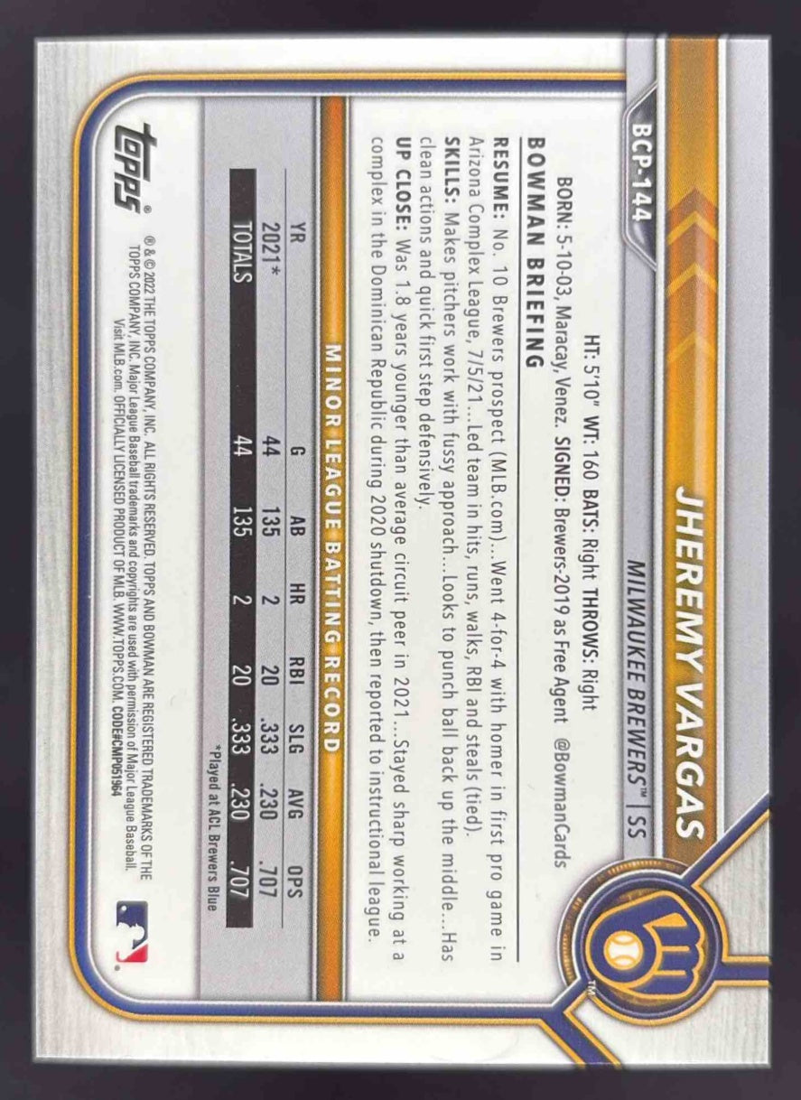 2022 Bowman Sapphire Chrome Red #BCP-144 Jheremy Vargas RC /10