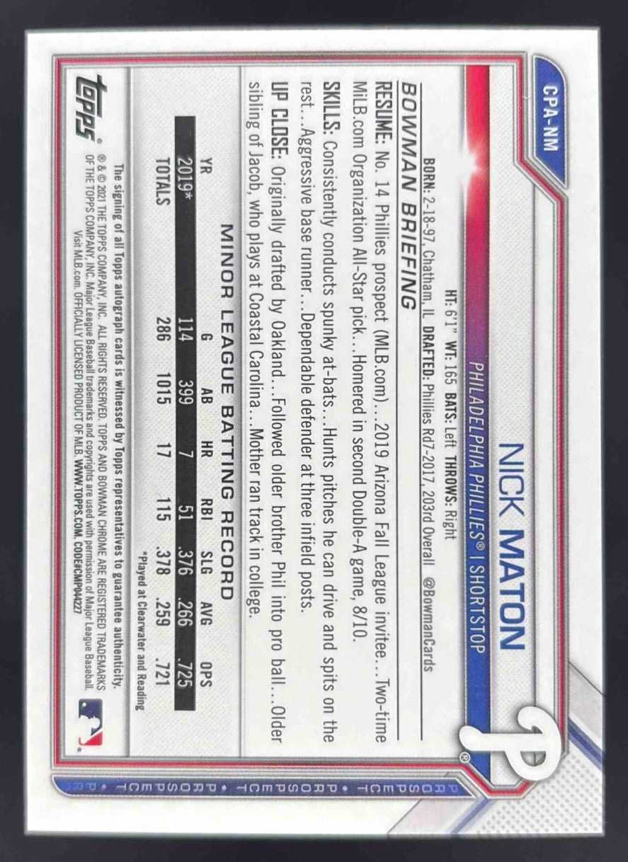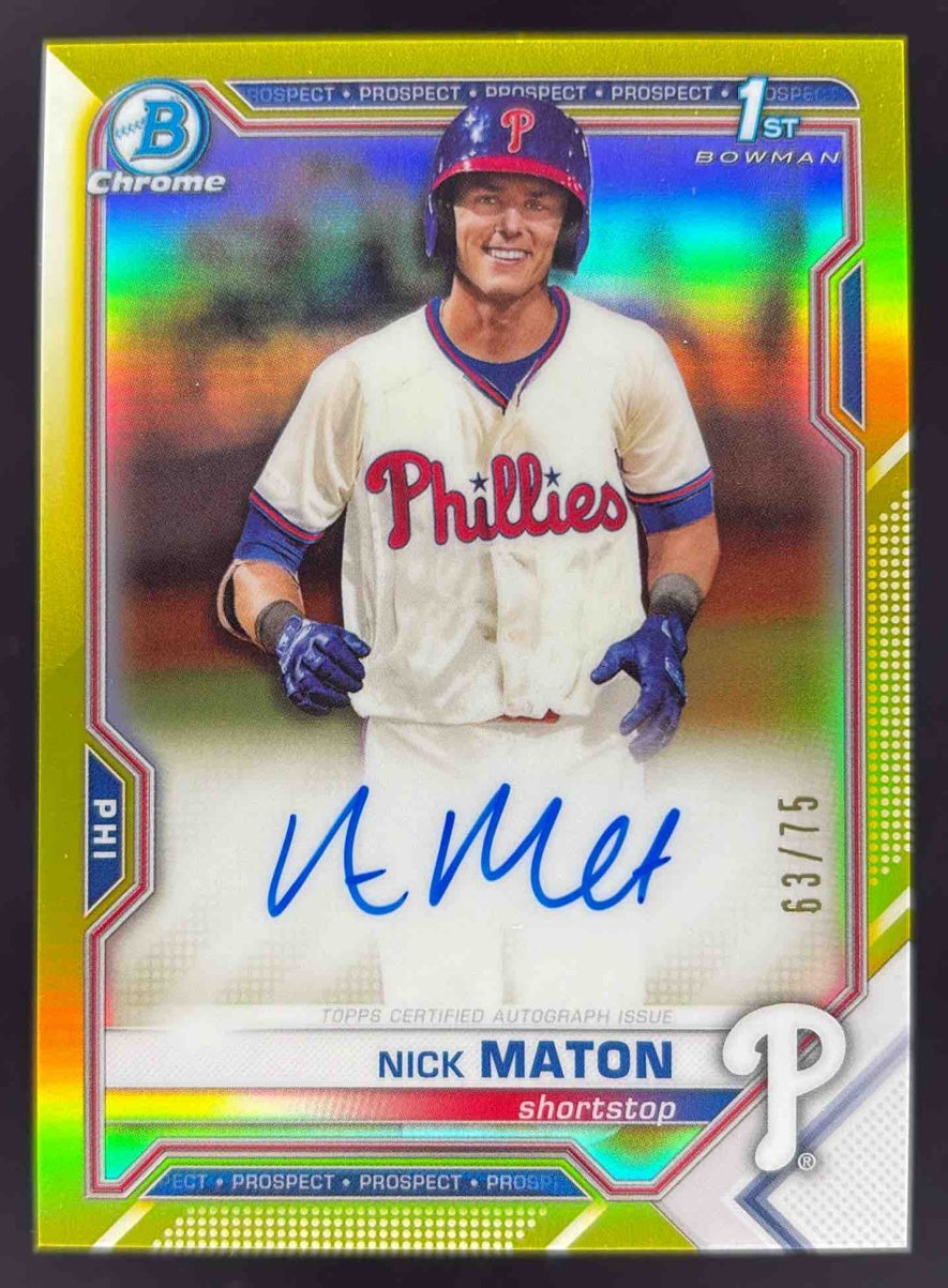 2021 Bowman Chrome Autographs Yellow Refractor #CPA-NM Nick Maton RC Auto /75