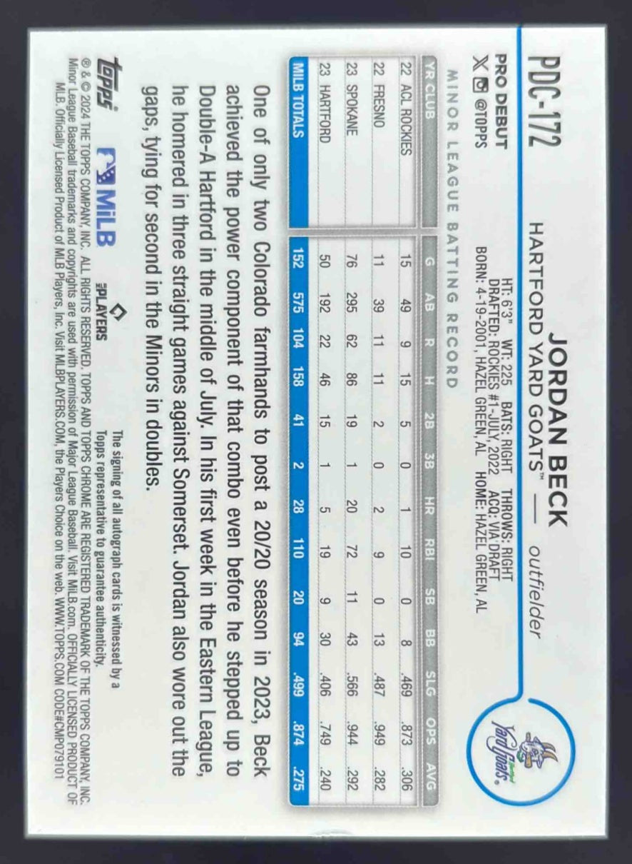 2024 Topps Pro Debut Chrome Gold Mini-Diamond #PDC-172 Jordan Beck RC Auto /50