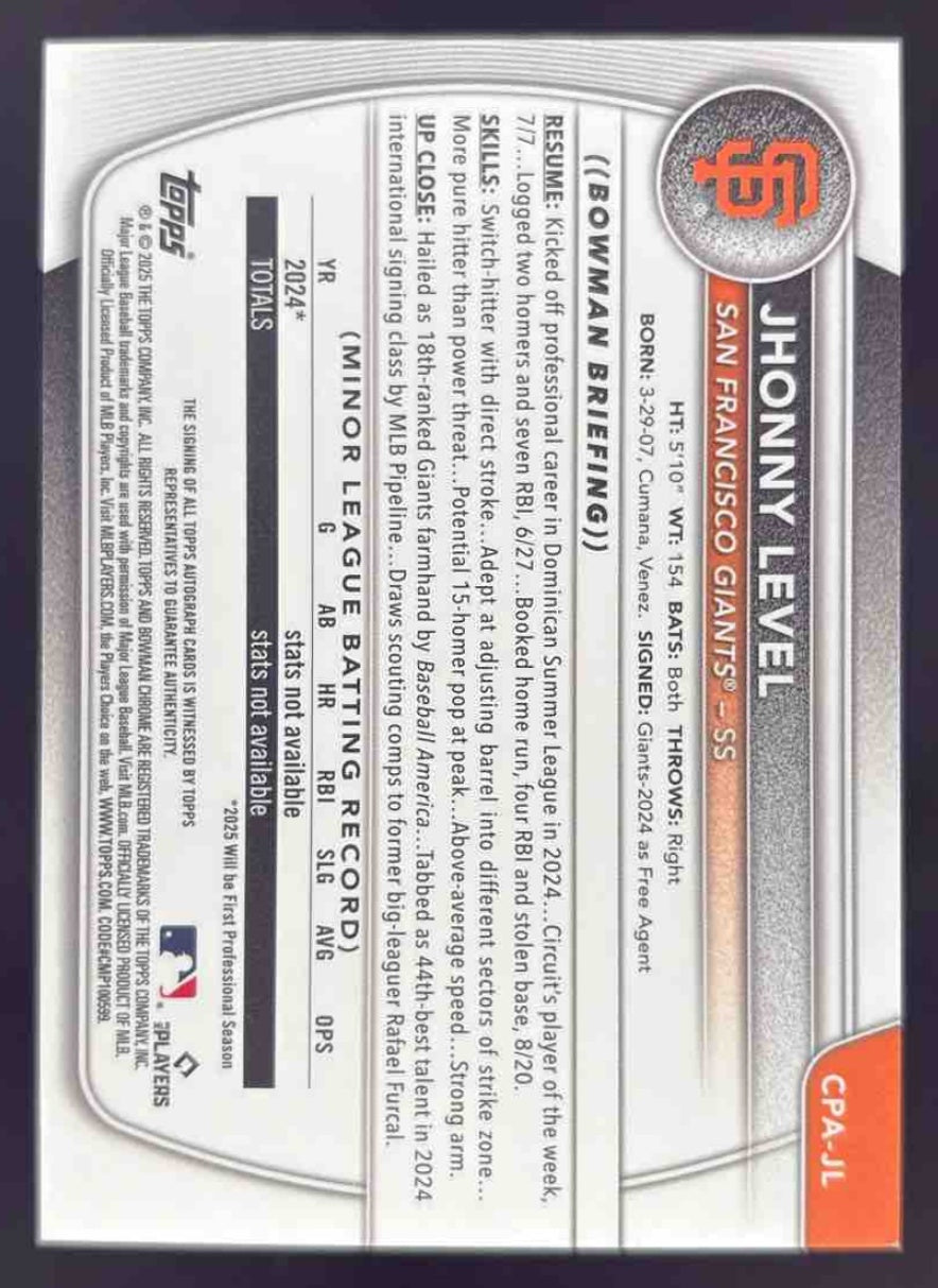 2025 Bowman Chrome Autographs Purple Refractor #CPA-JL Jhonny Level RC Auto /250