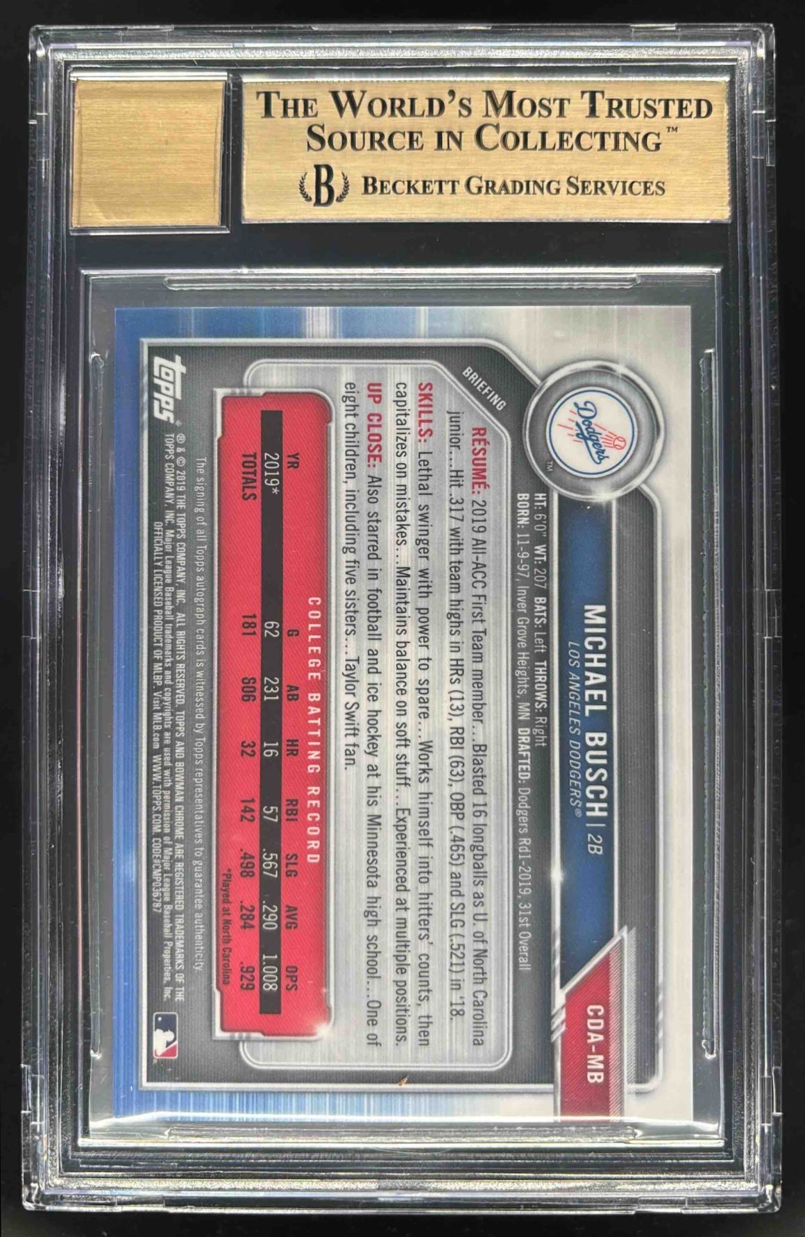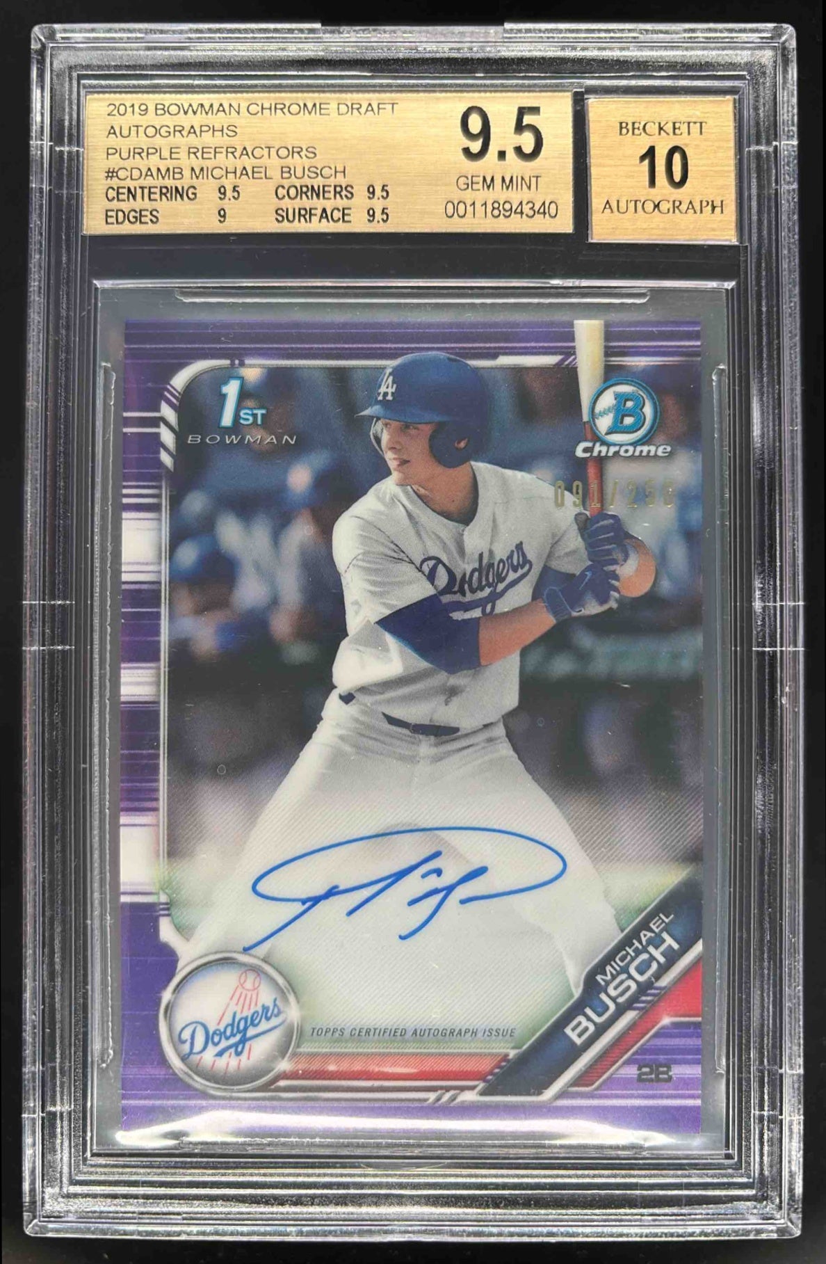 2019 Bowman Draft Chrome Purple Refractor #CDAMB Michael Busch Auto /250 BGS 9.5