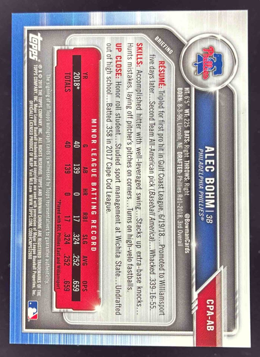 2019 Bowman Chrome Prospect Autograph Green Refractor #CPA-AB Alec Bohm Auto /99