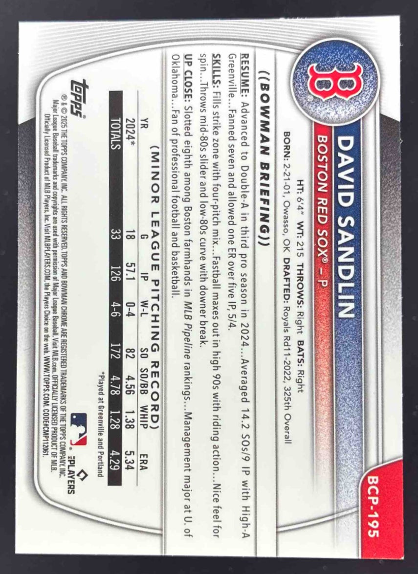 2025 Bowman Chrome Prospects Sunflower Seeds Refractor #BCP-195 David Sandlin RC