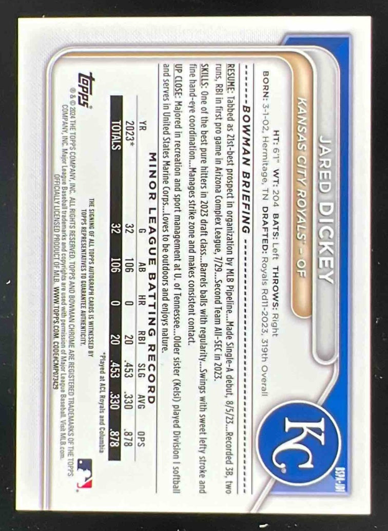 2024 Bowman Sapphire Chrome Sapphire Autographs #BSPA-JDI Jared Dickey RC Auto