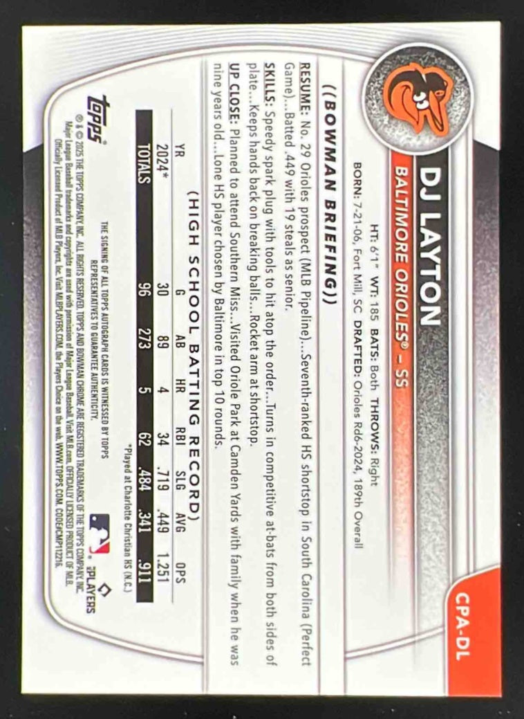 2025 Bowman Chrome Autograph Purple Refractor #CPA-DL DJ Layton RC Auto /250