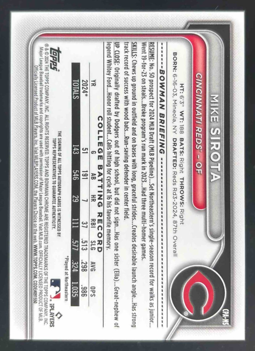 2024 Bowman Chrome Autographs Purple Refractor #CPA-MS Mike Sirota RC Auto /250
