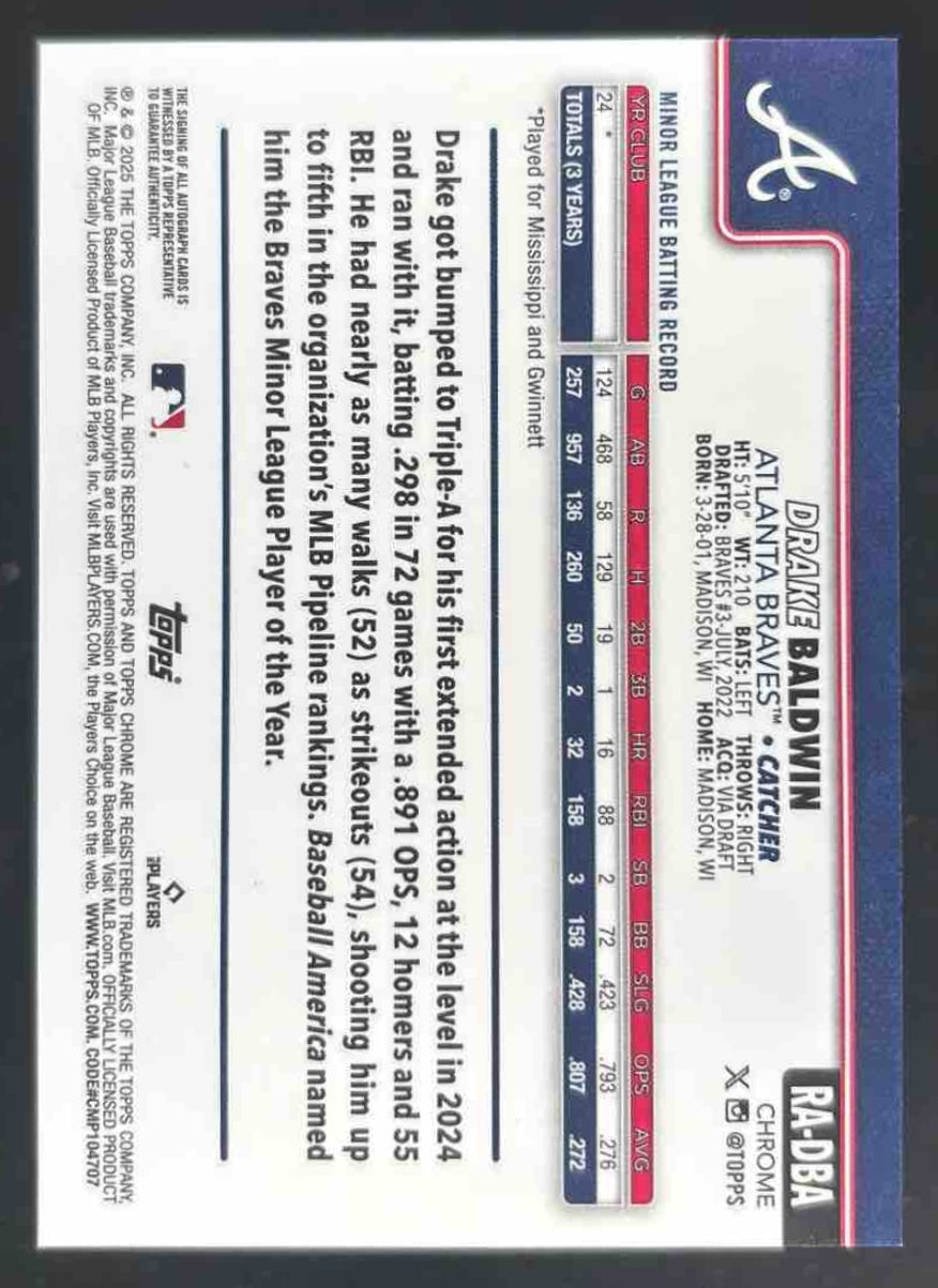 2025 Topps Chrome Rookie Autographs #RA-DBA Drake Baldwin RC Auto