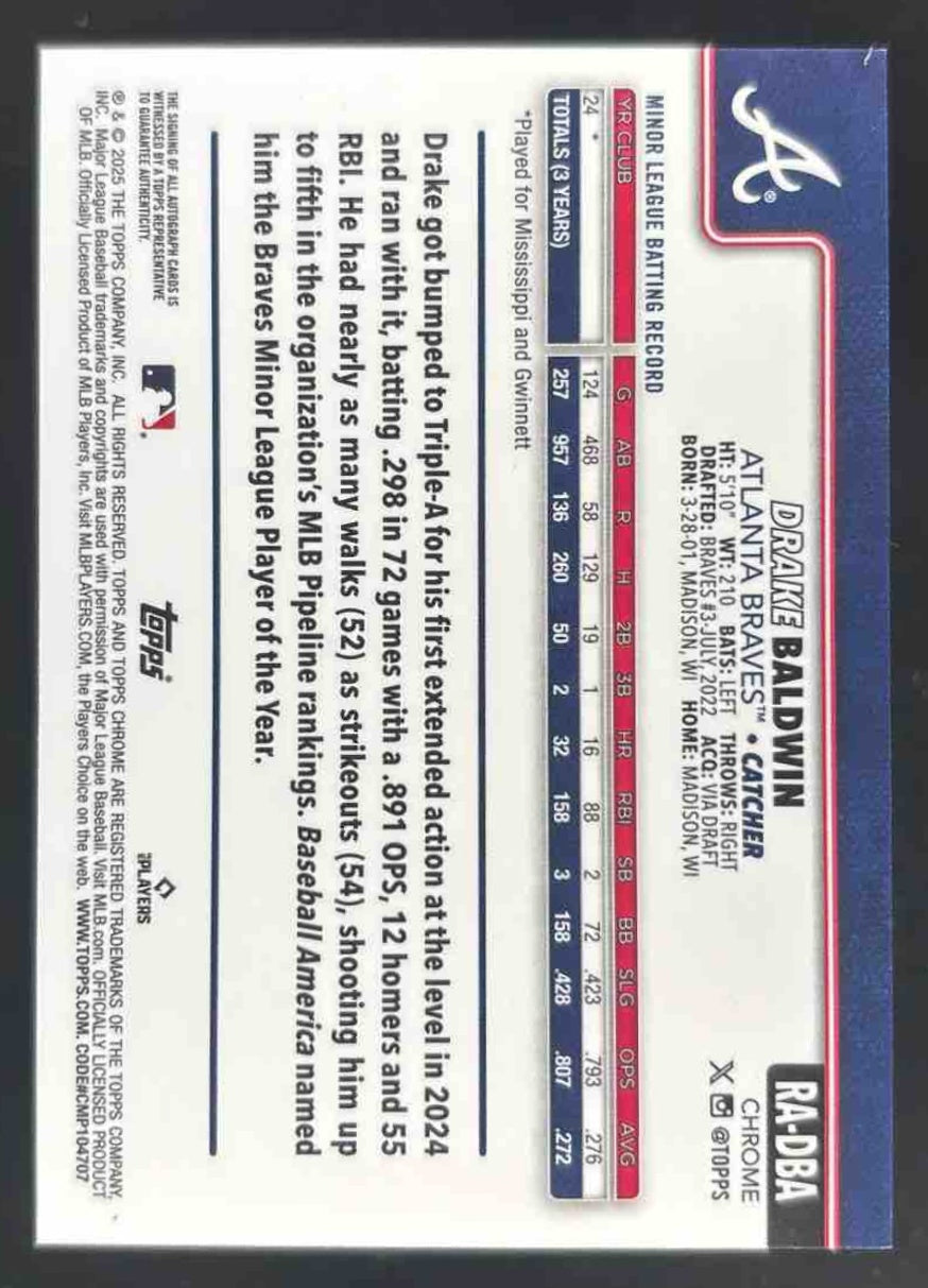 2025 Topps Chrome Rookie Autographs #RA-DBA Drake Baldwin RC Auto