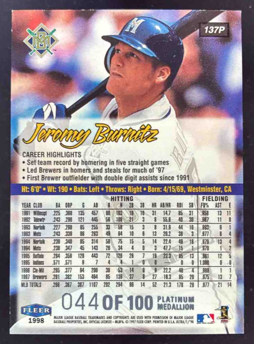 1998 Fleer Ultra Platinum Medallion #137P Jeromy Burnitz /100