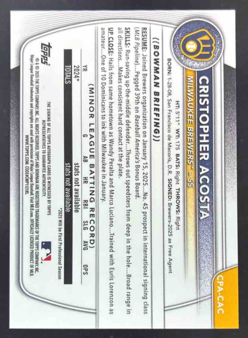 2025 Bowman Chrome Gold Shimmer Refractor #CPA-CAC Cristopher Acosta RC Auto /50
