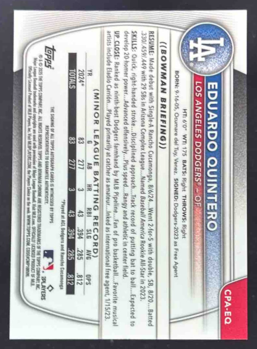 2025 Bowman Chrome Autographs #CPA-EQ Eduardo Quintero RC Auto