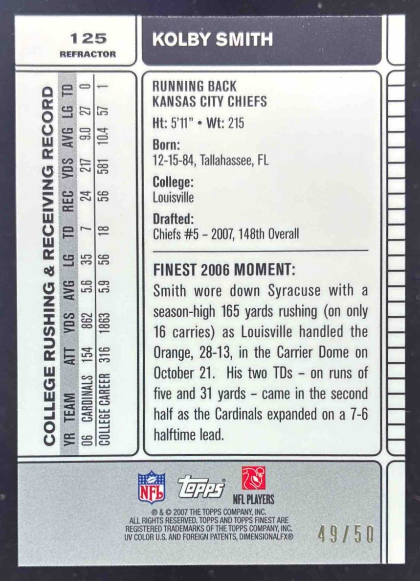 2007 Topps Finest Gold Refractors #125 Kolby Smith RC /50