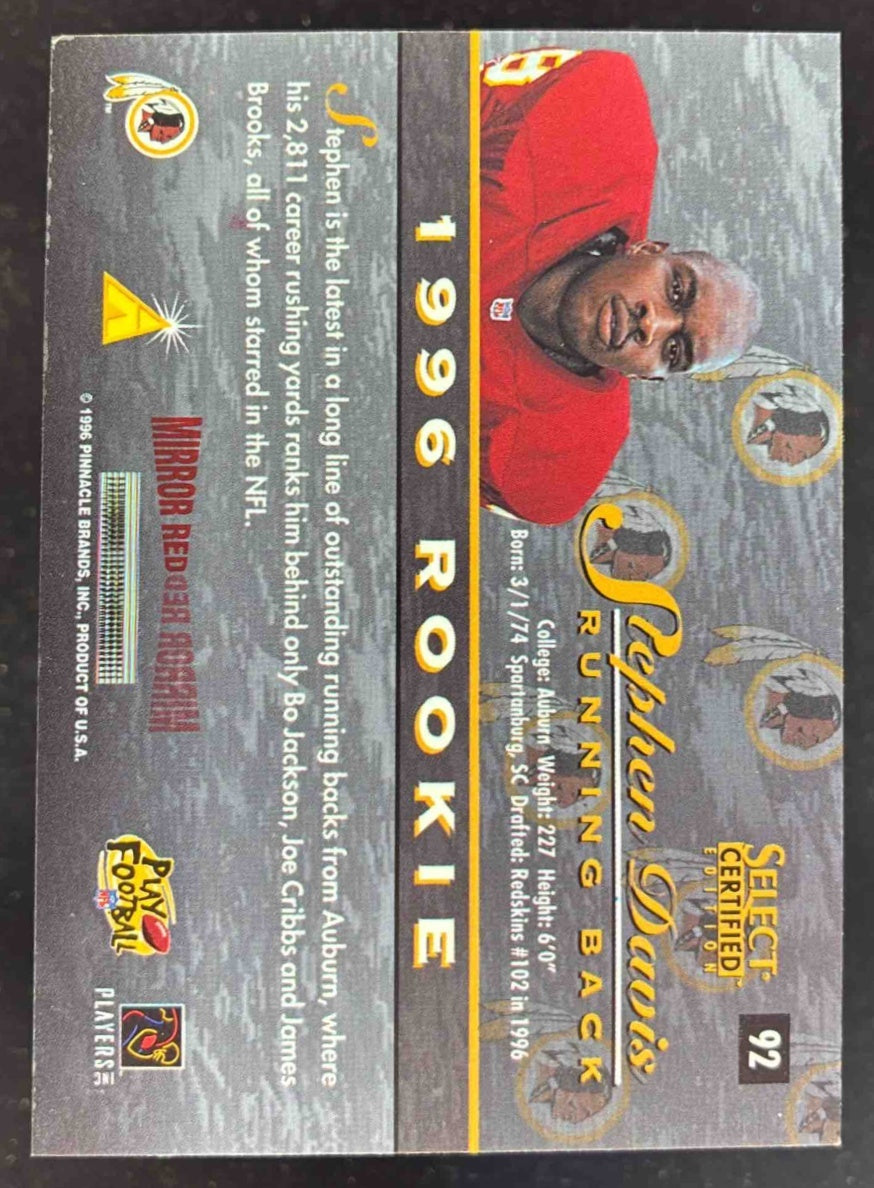 1996 Pinnacle Select Certified Mirror Red #92 Stephen Davis RC