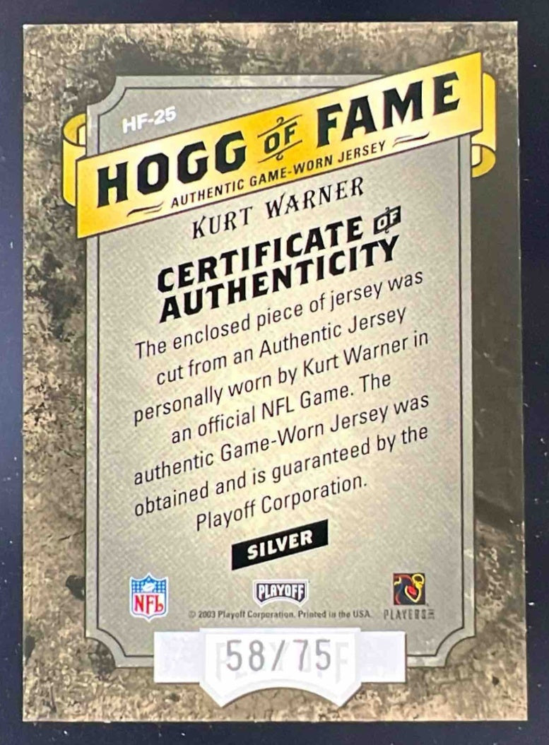2003 Playoff Hogg Heaven Hogg of Fame Materials Silver #HF-25 Kurt Warner /75