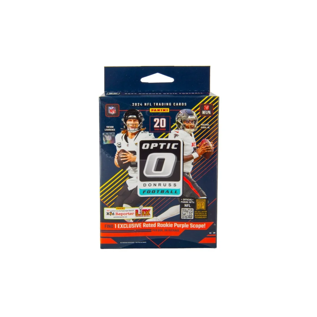 The flagship Donruss Football epically meets Optichrome technology with 2024 Donruss Optic Football, a dynamic product honoring the game's top stars and hottest rookies. Featuring the Loaded 2024 Rookie Draft Class! Find 1 Exclusive Rated Rookie Purple Scope per box on average!