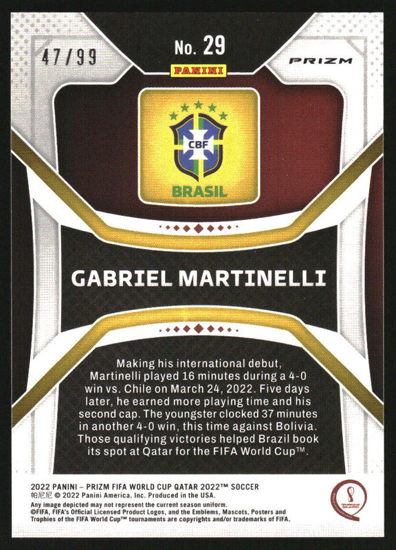 2022 Panini Prizm World Cup Prizms Purple Wave #29 Gabriel Martinelli RC /99