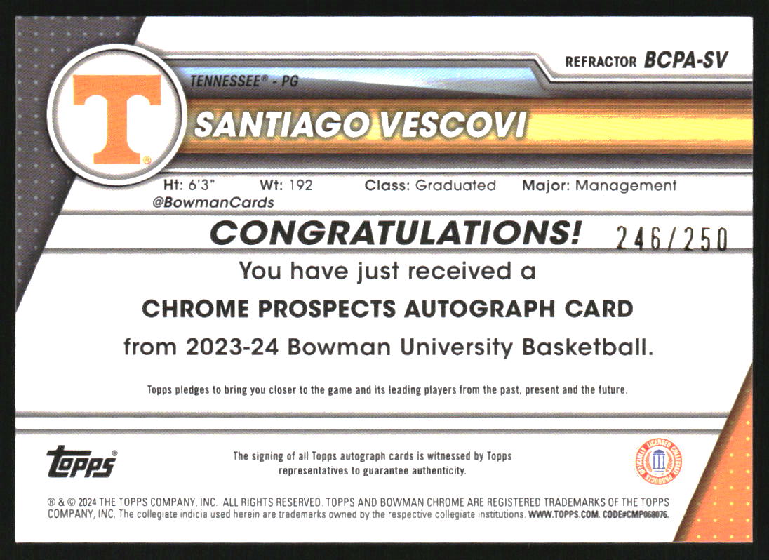 2023 Bowman Chrome University Prospect Autograph Santiago Vescovi RC Auto /250