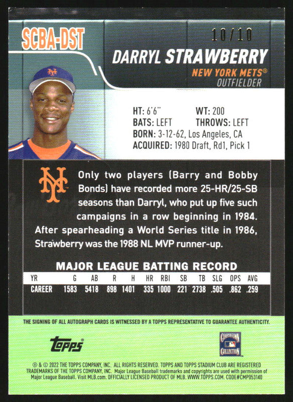 2022 Topps Stadium Club Autographs Rainbow Foil #DST Darryl Strawberry Auto /10