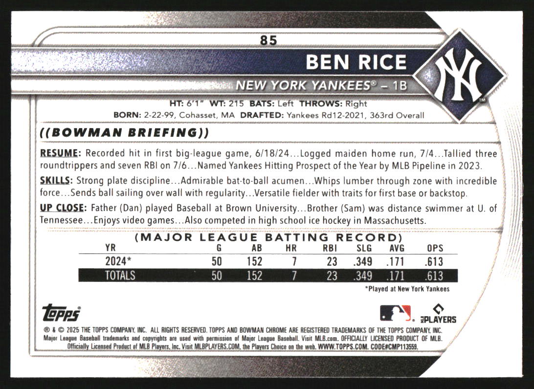 2025 Bowman Chrome Red RC Rookie Redemption #85 Ben Rice RC