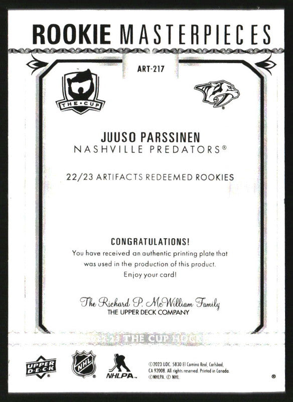 2022 The Cup Rookie Masterpieces Printing Plate Magenta Juuso Parssinen RC 1/1