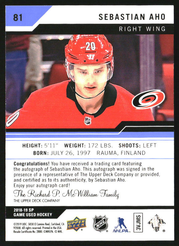 2018-19 SP Game Used Blue Autographs #81 Sebastian Aho Autograph Auto