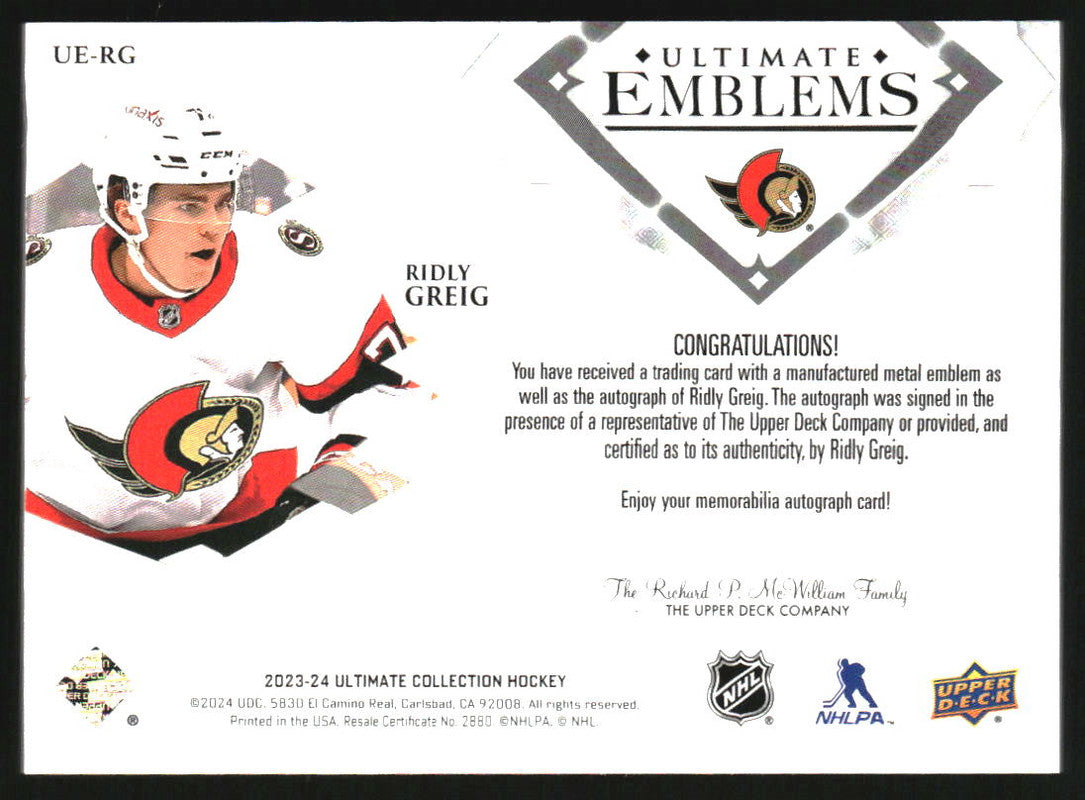 2023 Ultimate Collection Ultimate Emblems Autographs #UERG Ridly Greig Auto /99