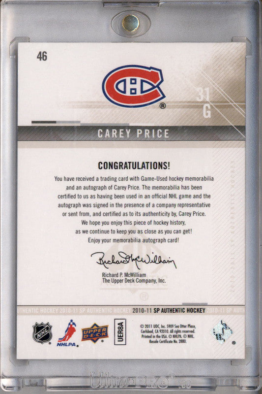 2010-11 SP Authentic Limited Autographed Patches #46 Carey Price Auto /25