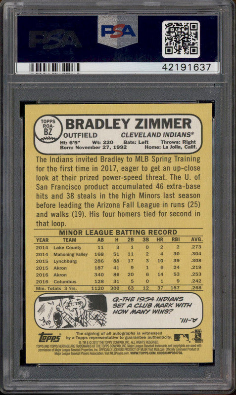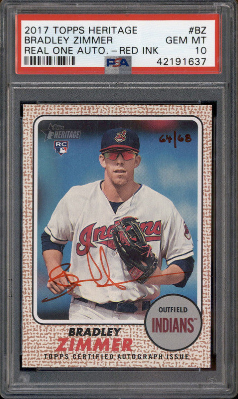 2017 Topps Heritage Real One Red Ink #BZ Bradley Zimmer RC Auto /68 PSA 10
