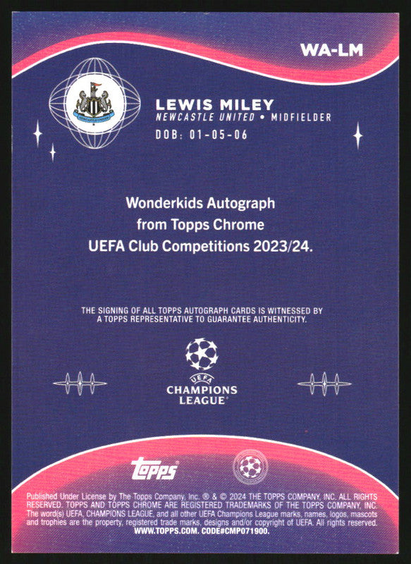 2023 Topps Chrome UEFA Wonderkids Autographs #WALM Lewis Miley Autograph RC Auto