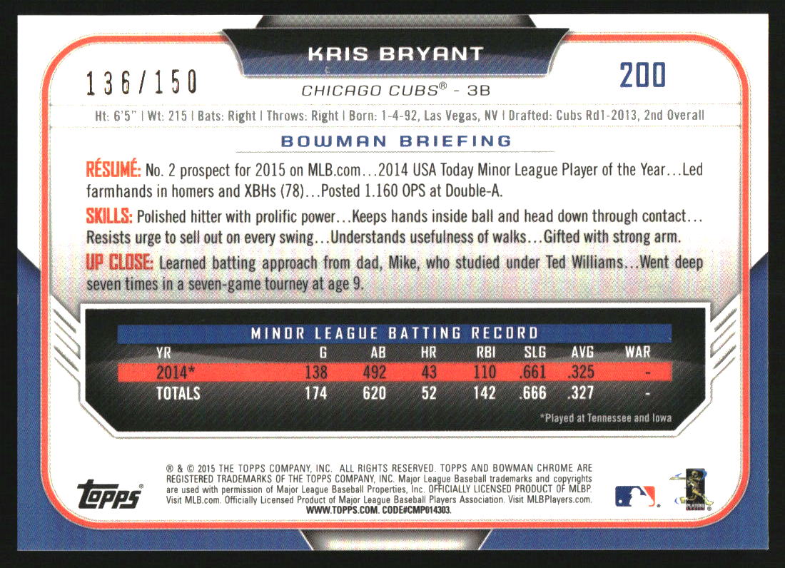 2015 Bowman Chrome Blue Refractors #200 Kris Bryant RC /150
