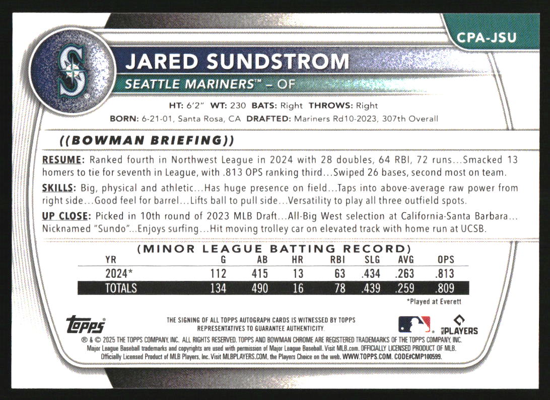2025 Bowman Chrome Autographs #CPA-JSU Jared Sundstrom RC Auto
