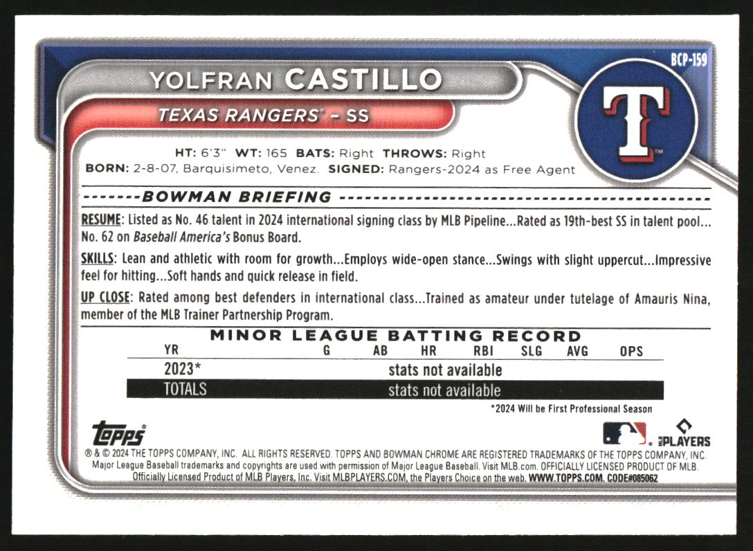 2024 Bowman Chrome Chrome Gold Shimmer Refractor #BCP159 Yolfran Castillo RC /50